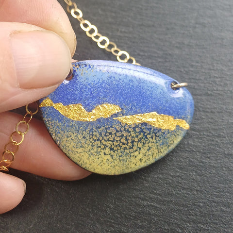 This hand crafted pendant is made from copper and decorated with layers of vitreous enamel. The enamel has been applied in layers and removed in places to reveal the colours beneath. The gold foil is contained within the surface by a clear layer of enamel and glows like sunlight.